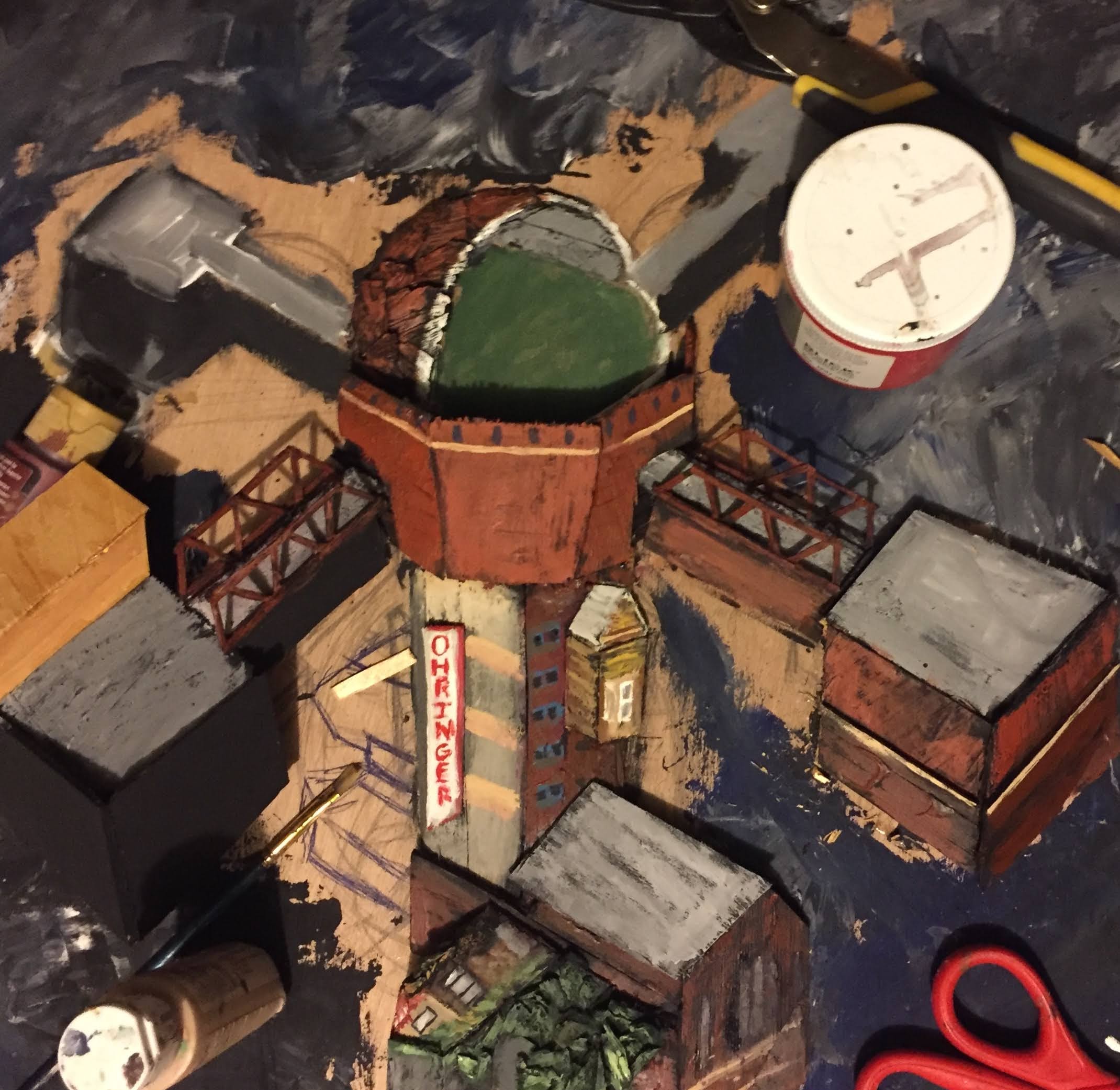 The third entry into my rust belt futurism series, this is probably the most carefully constructed. I did number of sketches beforehand, trying to get the angle right and my use of forced perspective was a journey of trial and error. I was surprised at all the math and angles I was happy to think through.