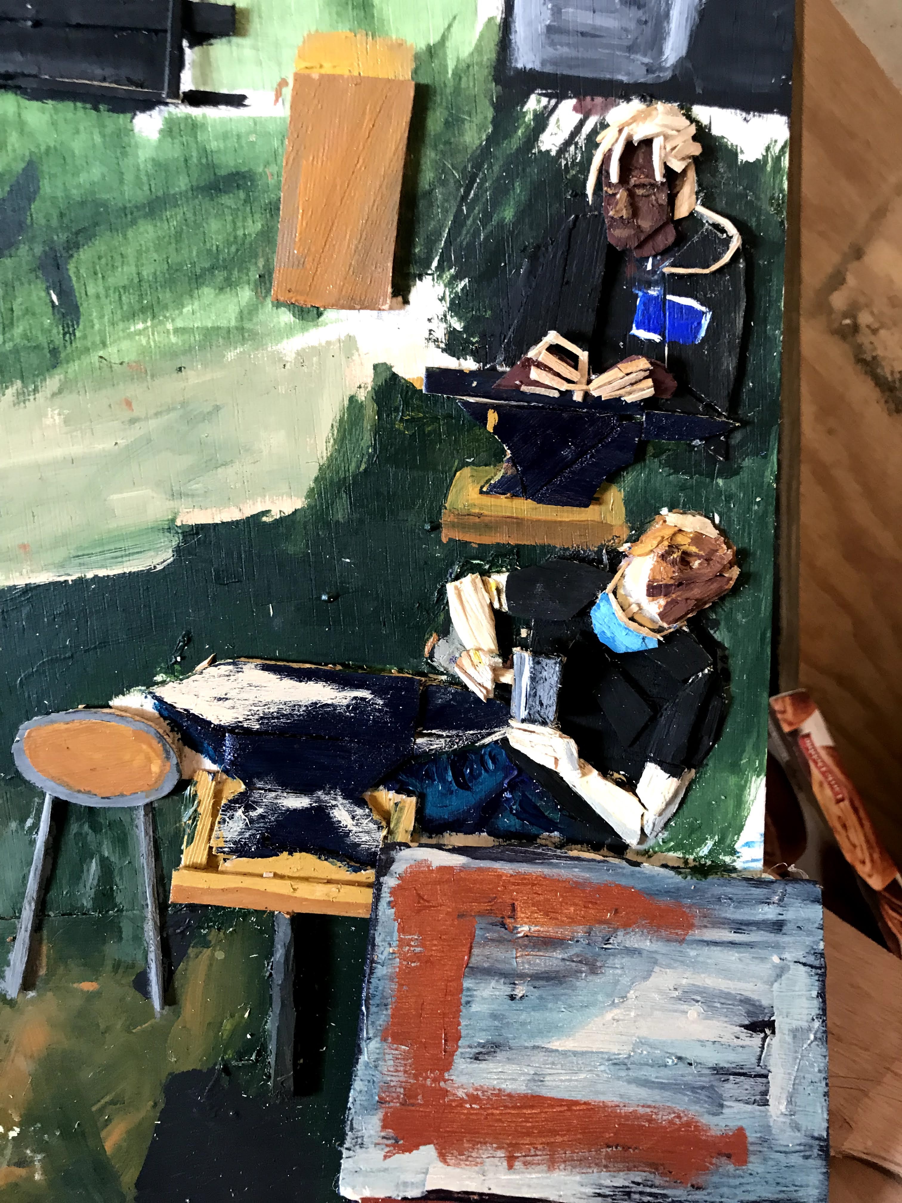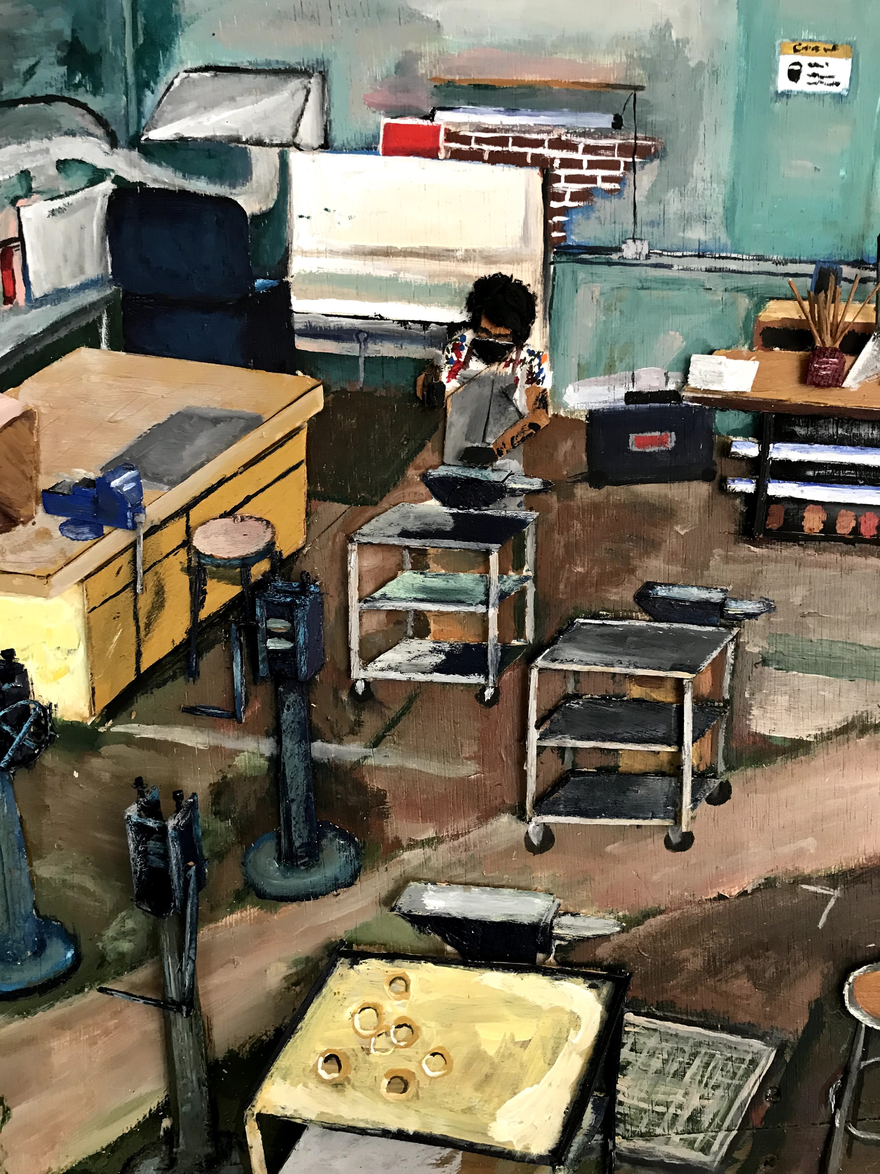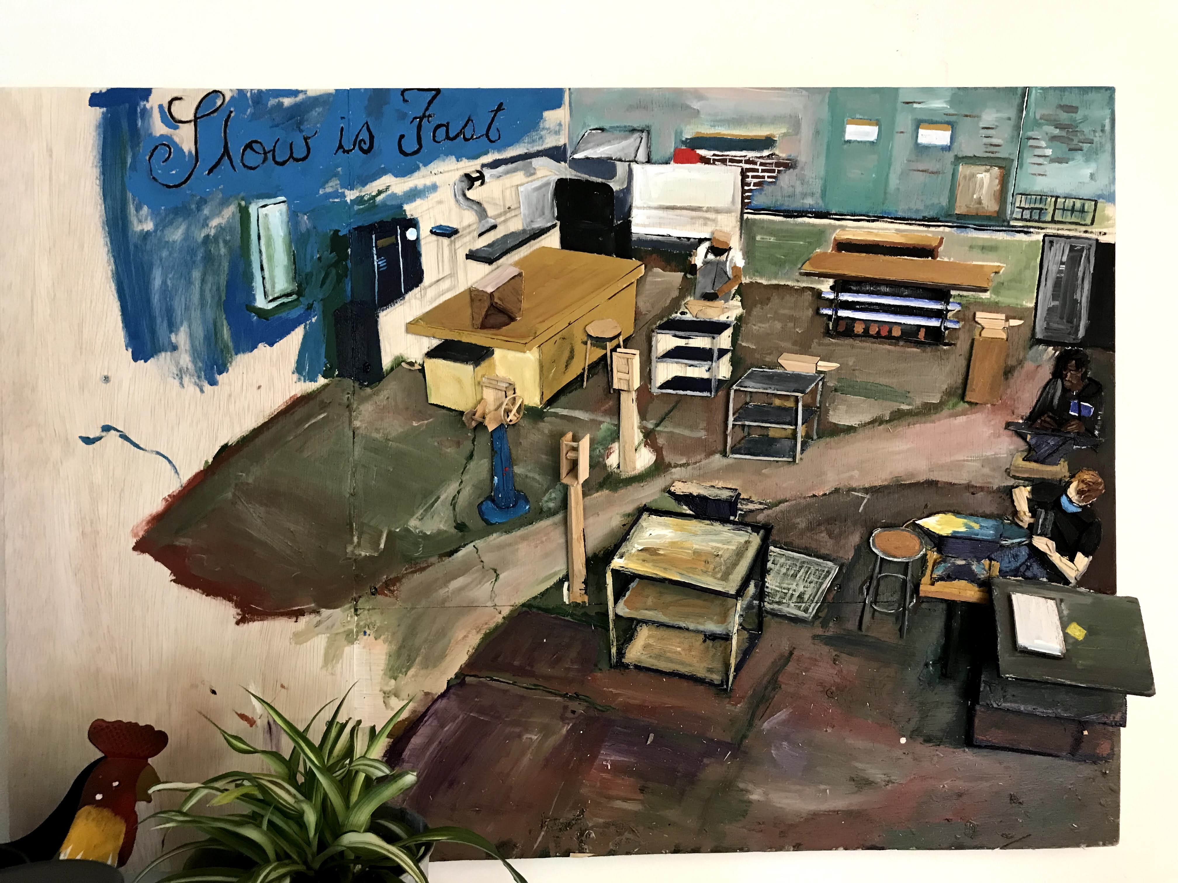 It took three ish months ( I think) to complete this. The goal was to make a space that draws the viewer in. Both of the tables are mostly 3 dimensional, matching the perspective of the two dimensional space. The illusion creates a felt depth that gives the viewer room to feel like they could put themselves inside the painting.