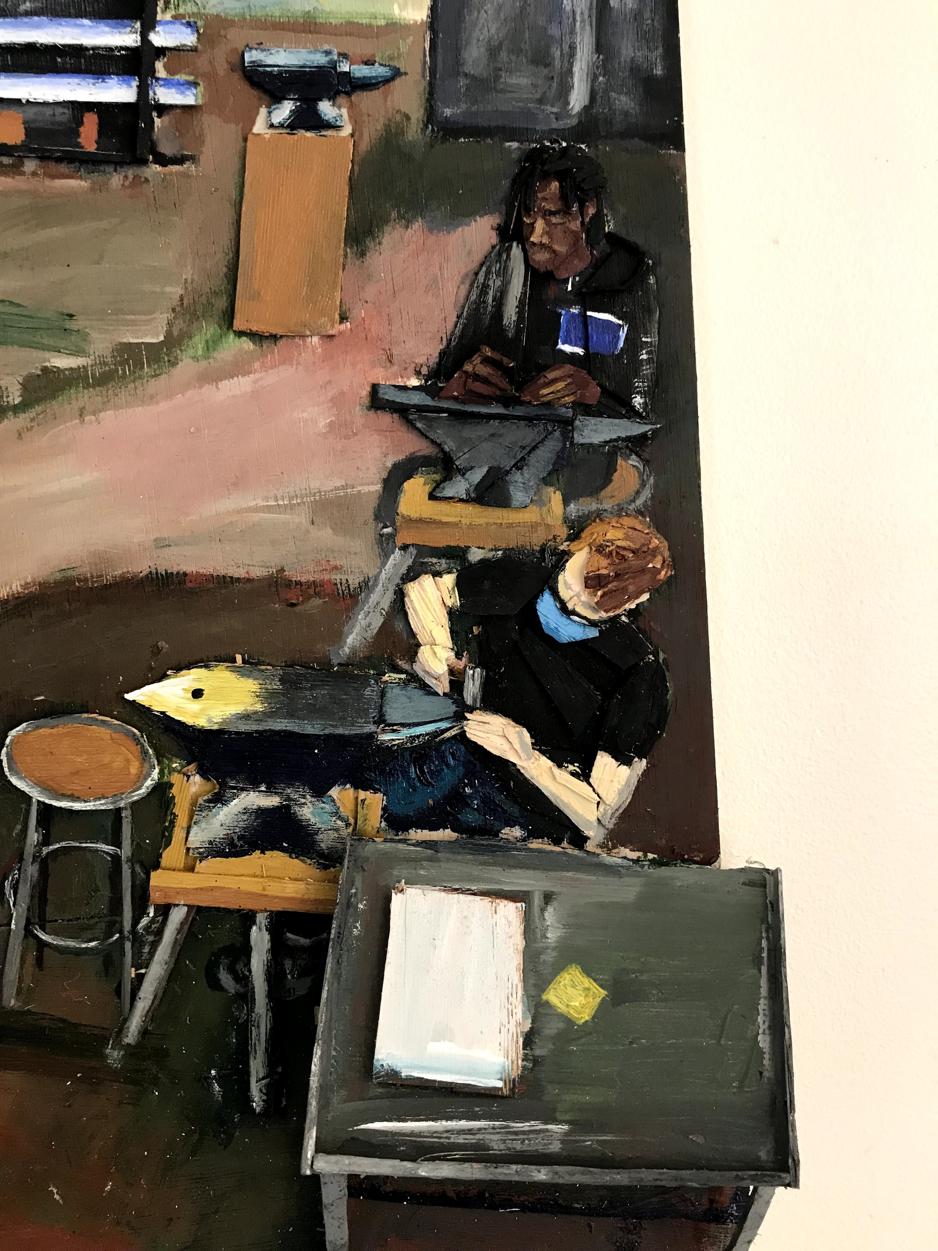 Is that what visual art does or should do? The answer for me right now is a strong maybe. I think the previous paragraph articulates something more or less accurate, but I’m not a hundred percent sure it’s correct. If paintings do that, this painting should do that too. It’s a cool space to be part of- it’s got cool machines, it’s got anvils, it’s a job environment to imagine being part of.