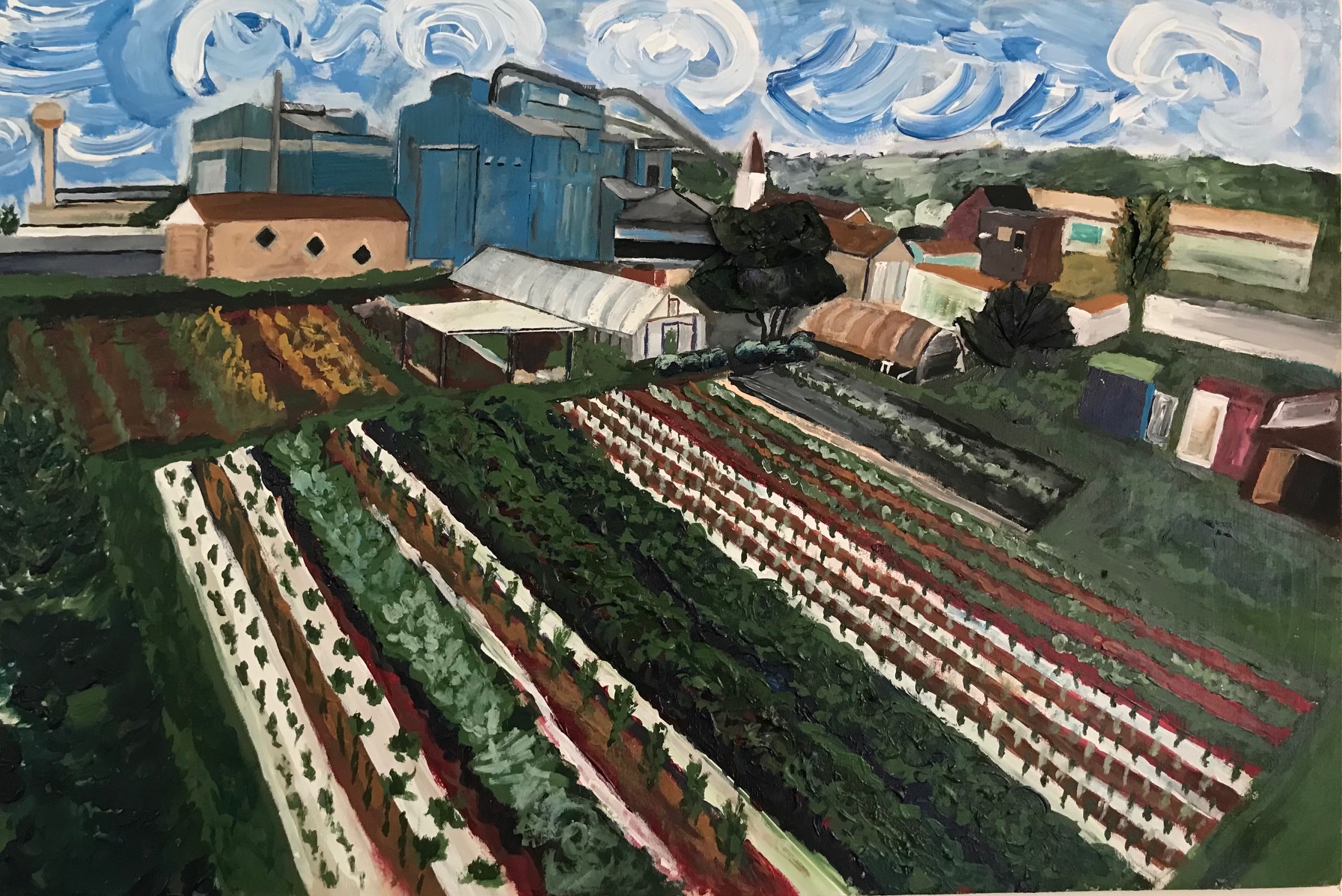 This is one of the strongest mostly paint paintings I’ve made in the recent years. While the physical objects are used, the vegetables and green space is all paint. I drew out the contrast of the blocky factory and more ephemeral clouds to high light the directional substance of the crop rows. I used thick paint to create the bush textures and a couple different kinds of green to help with differentiation.