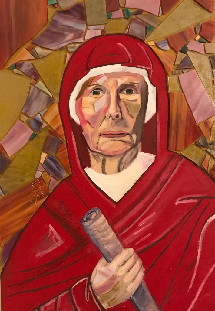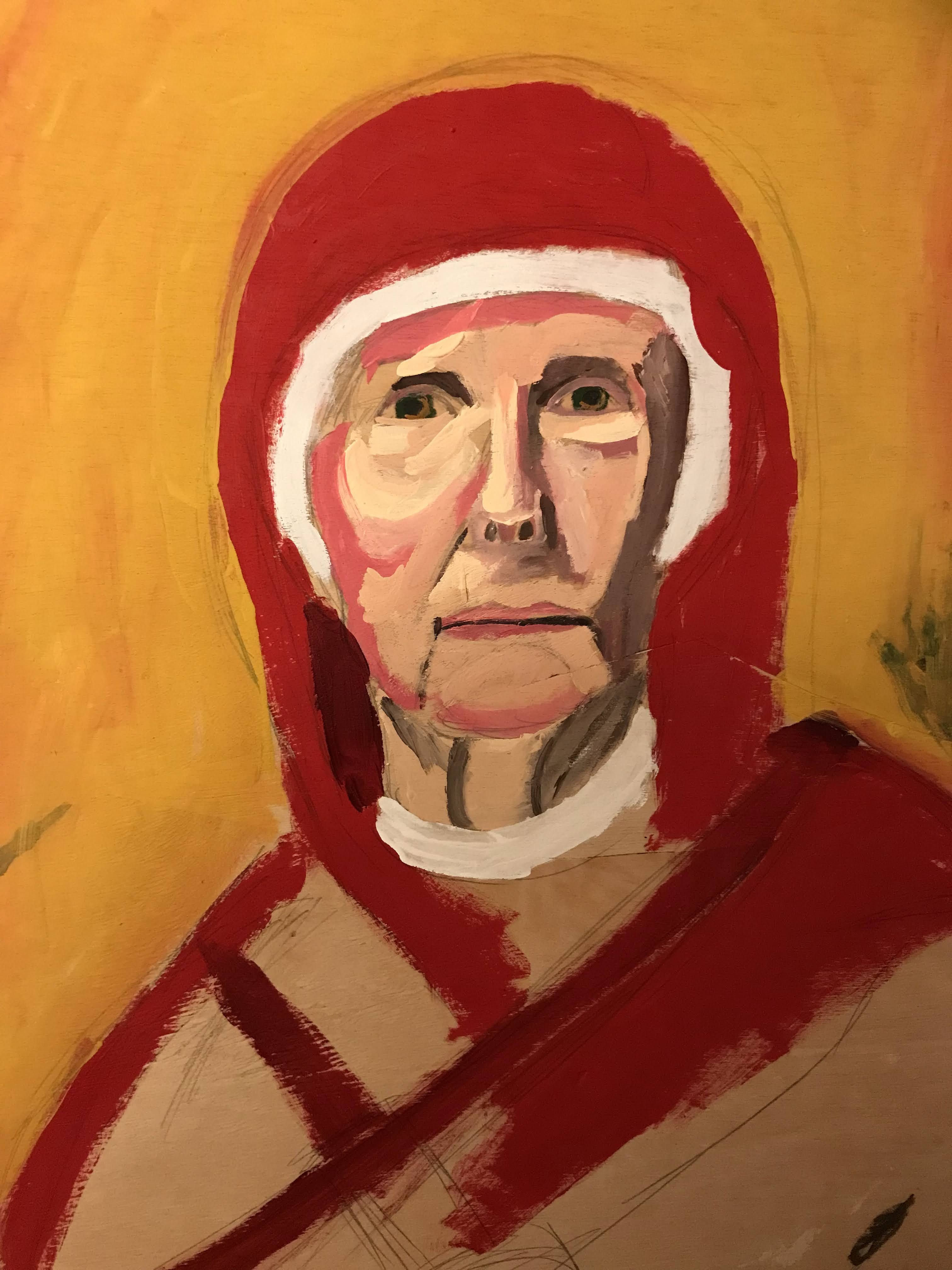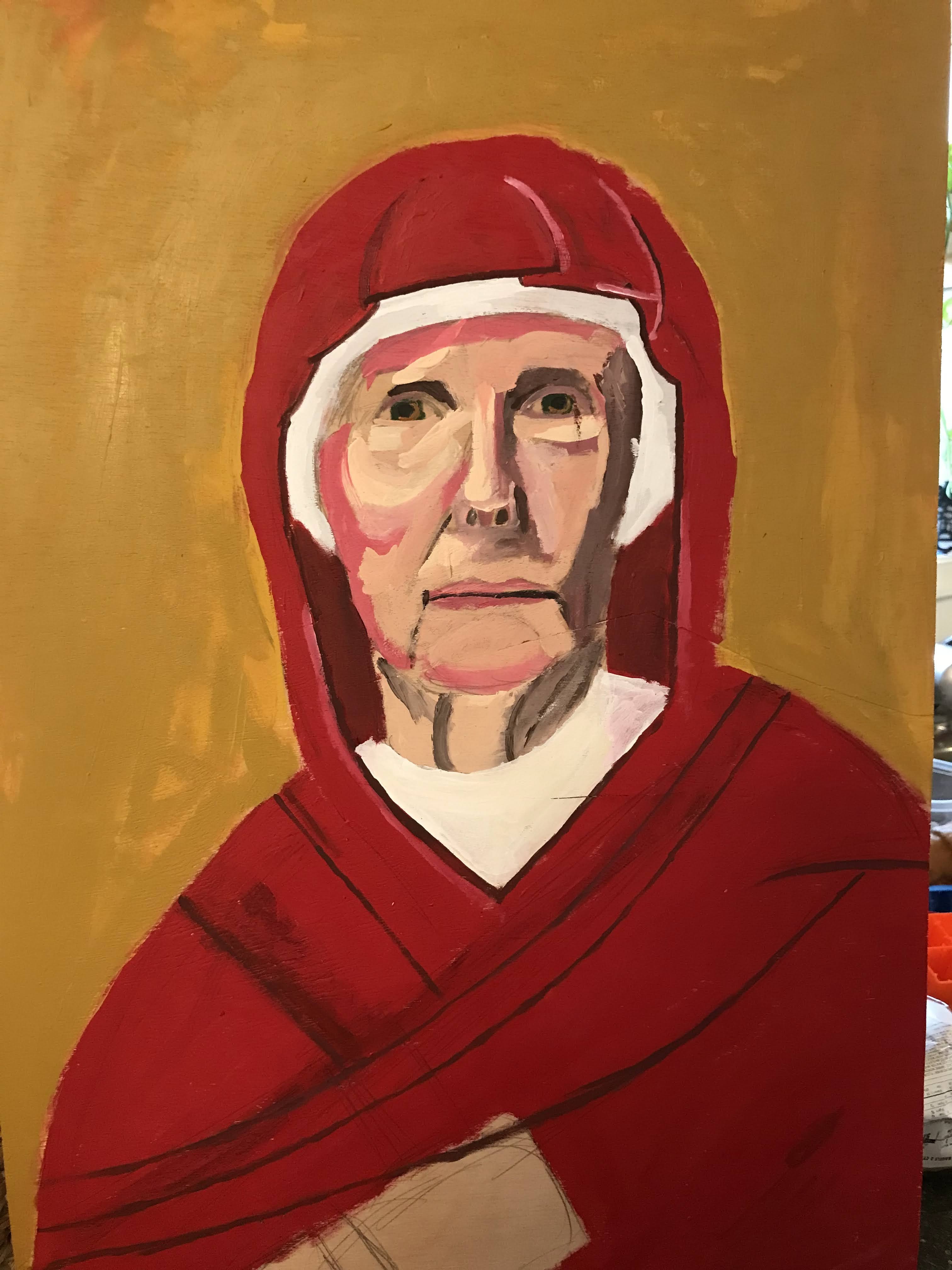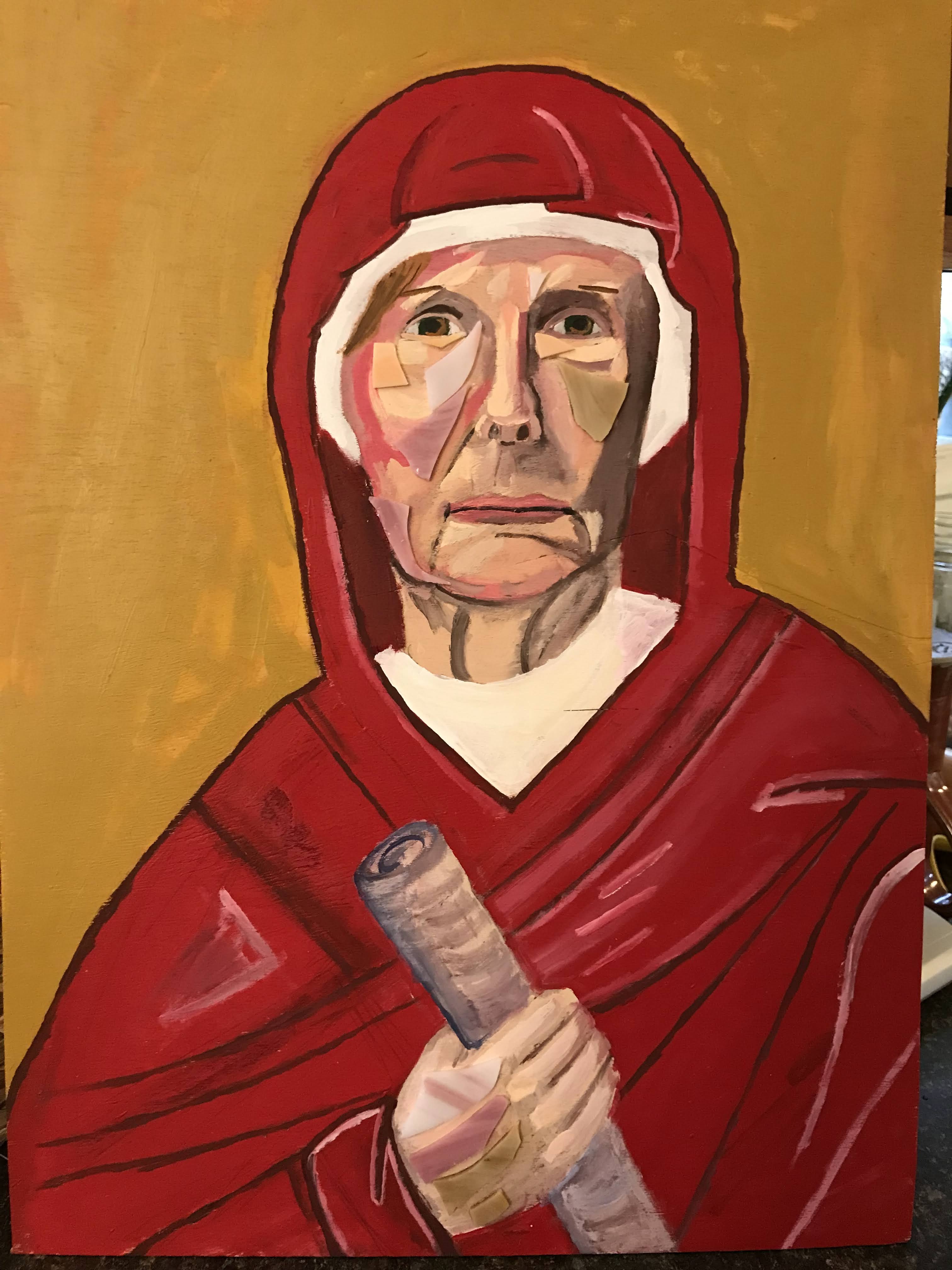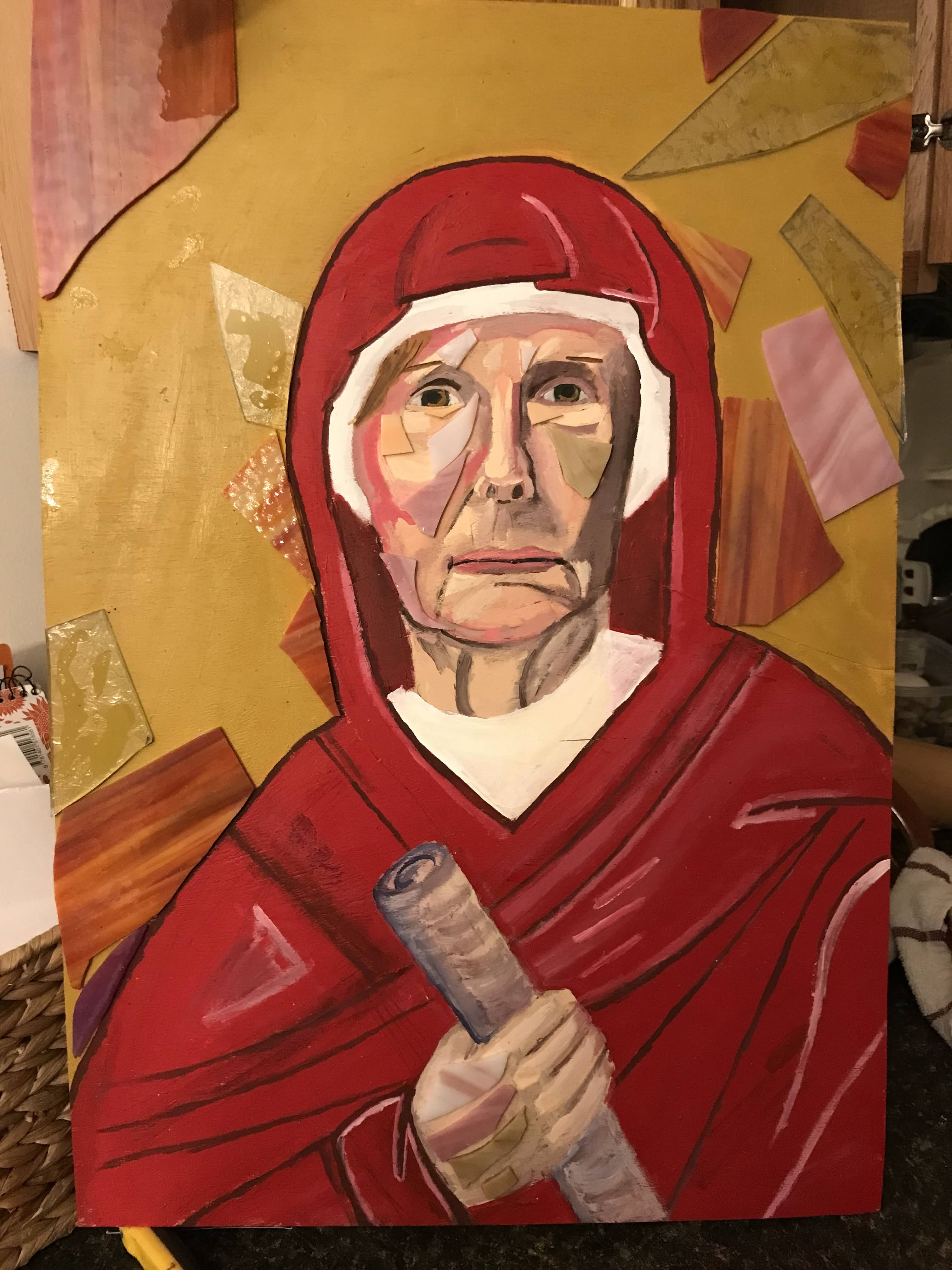 This painting is of a woman who is on the board of Mon Valley Initiative and is part of the Society of St. Vincent DePaul painted as Anna the prophet. It’s about waiting for change and fulfillment of faith.