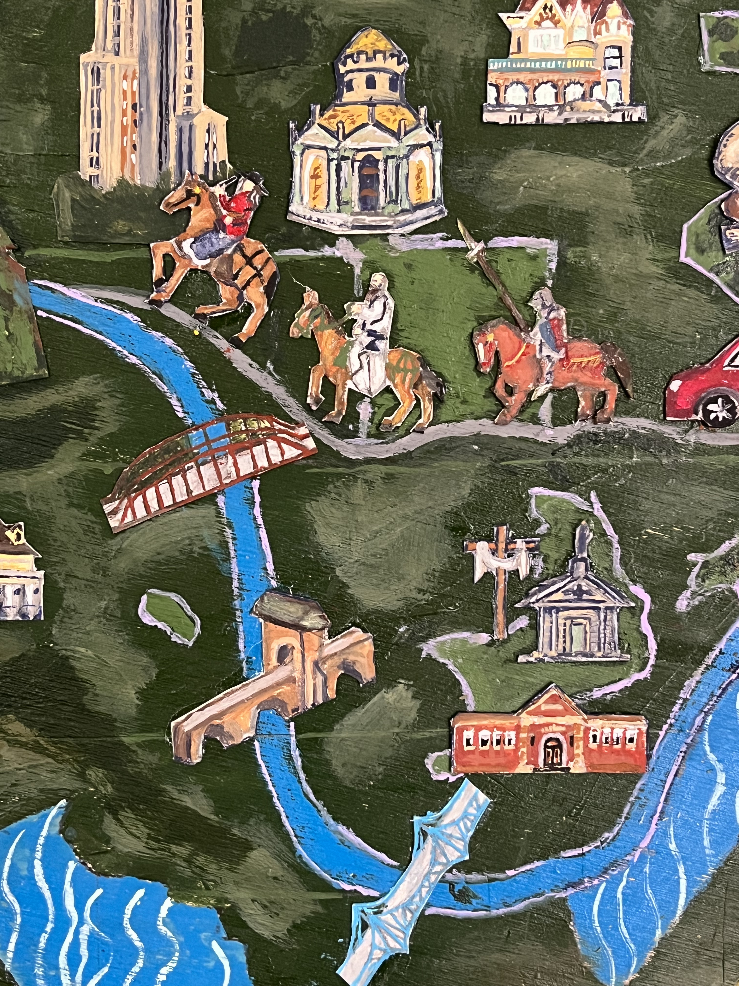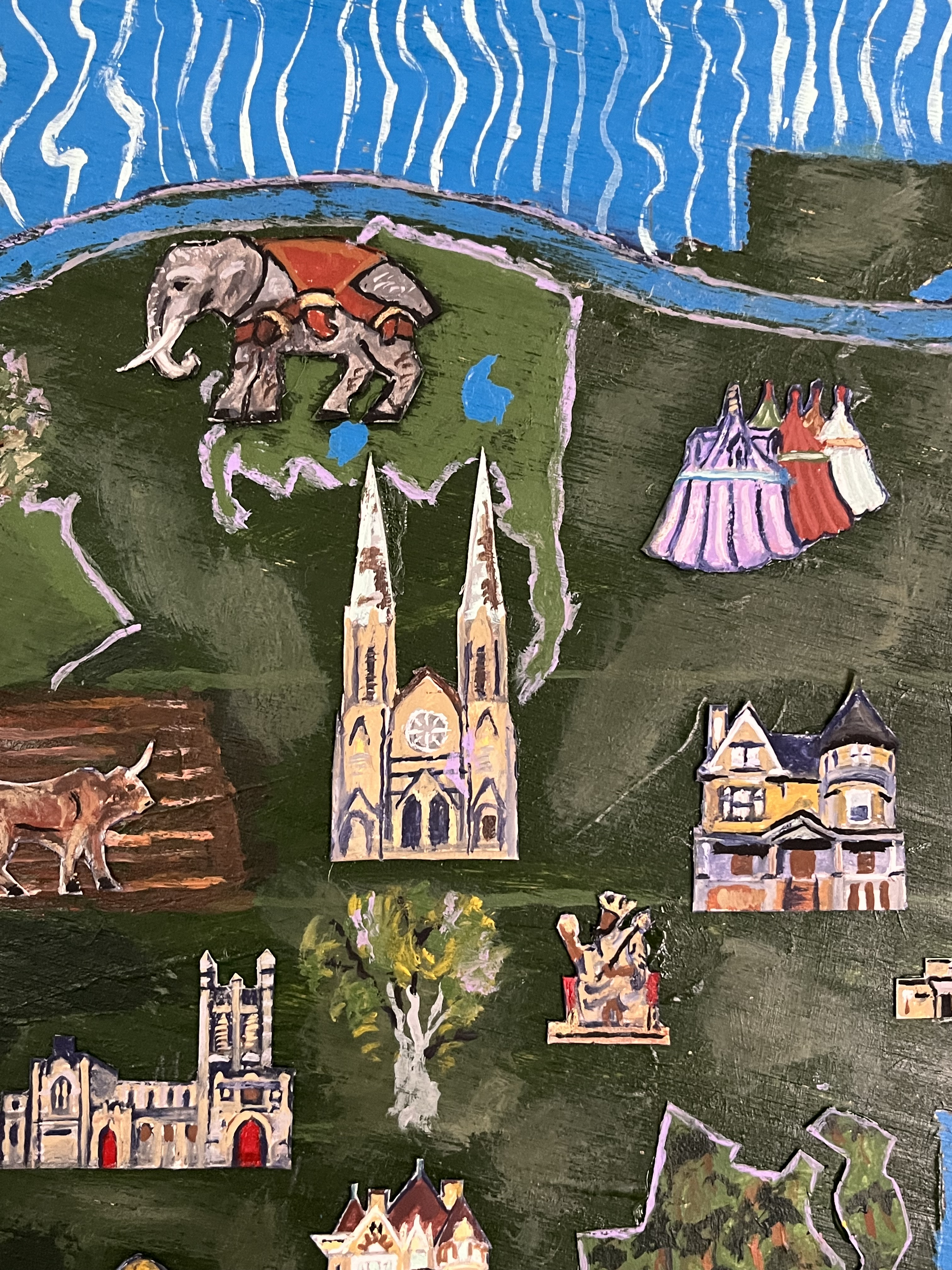 I wanted to create a sense of modern Pittsburgh as medieval, so I included some modern buildings that looked medieval, some modern buildings adjusted to be made medieval (downtown), some medieval buildings providing direct symbolic reference to modern Pittsburgh, and some just purely medieval objects.