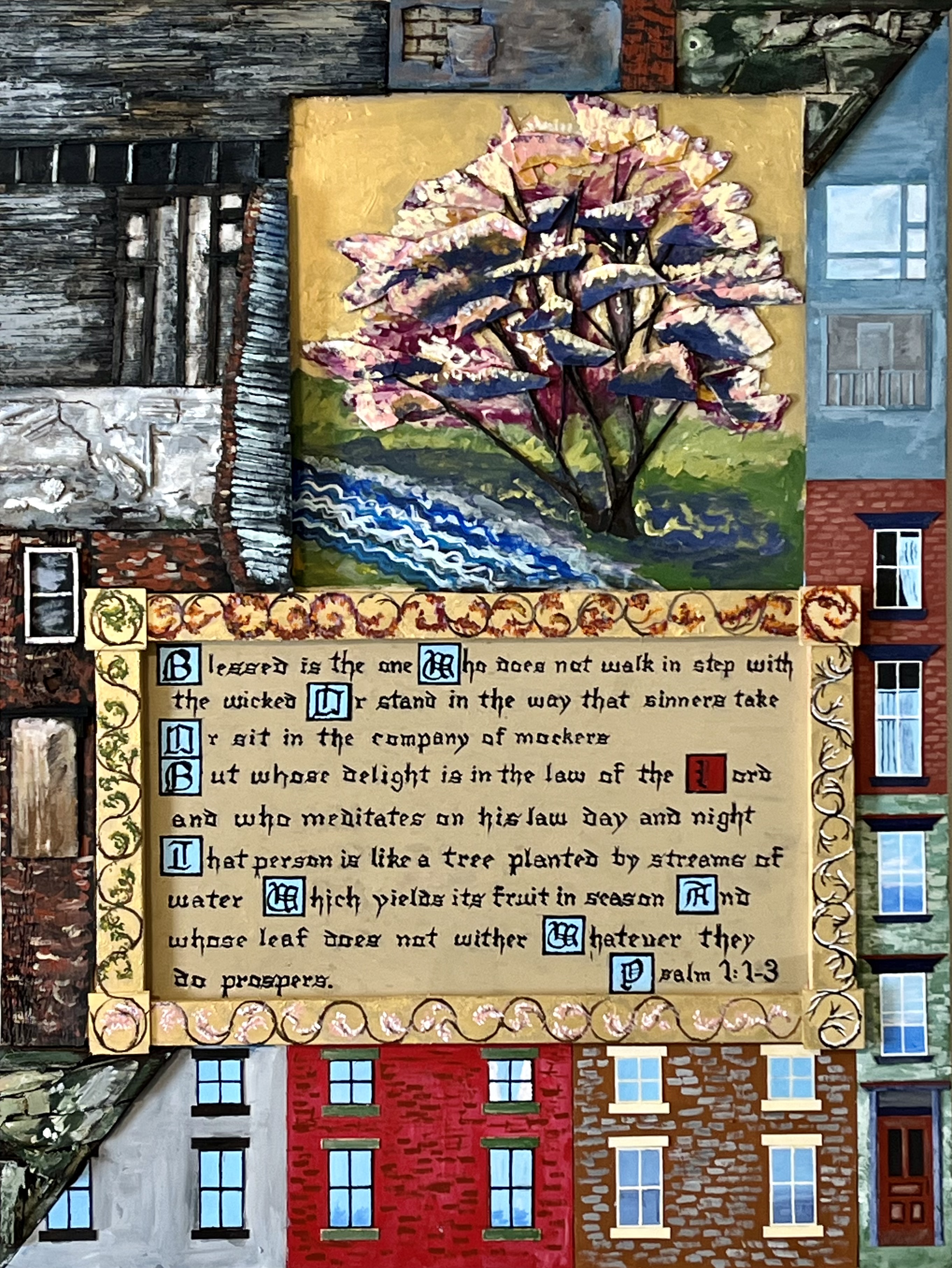 The buildings are half destroyed/half in good condition. There is a season motif around the calligraphy. The tree is a serviceberry, indigenous to this part of Pennsylvania.
