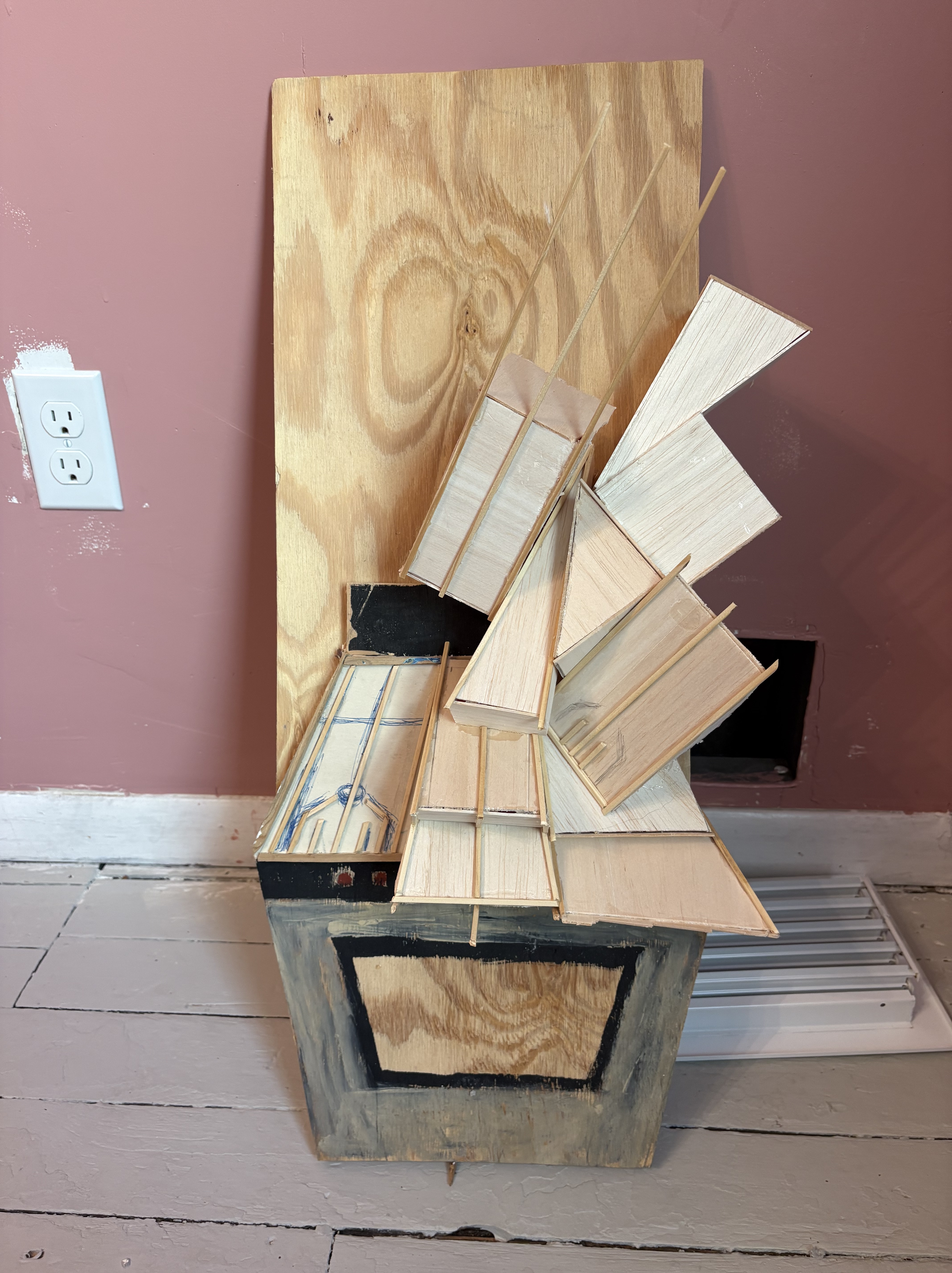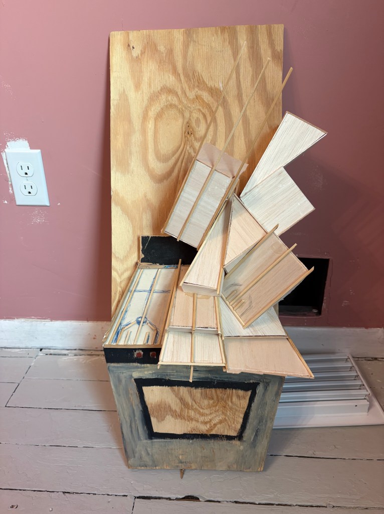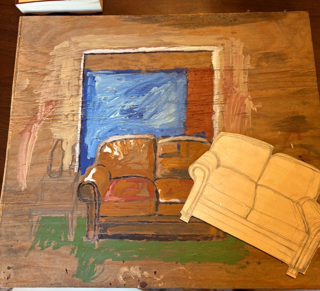 This is a classic project- I’m trying to build a living room painting. I know how to do it, I just have to develop it out. I’m going to layer the couch in a more ordered way to give the painting extra gravity. I might cut out the window in a future iteration- I’m not sure. My jigsaw broke and that’s made things a little harder/ slower.
